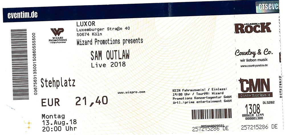 Gott sei Dank hatte der Jahrhundertsommer 2018 mit mir am 13.08.18 ein Einsehen und machte eine kleine Atempause, sodass ich wie geplant meine bereits im Vorverkauf bestellte Karte zum Sam Outlaw Konzert im Luxor in Köln zusammen mit meinem Begleiter wahrnehmen konnte.